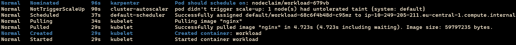 It took 59 seconds from Karpenter noticing a new node needs to be scheduled (which was instant) to the node being ready and scheduler assigning the pod to the node.
